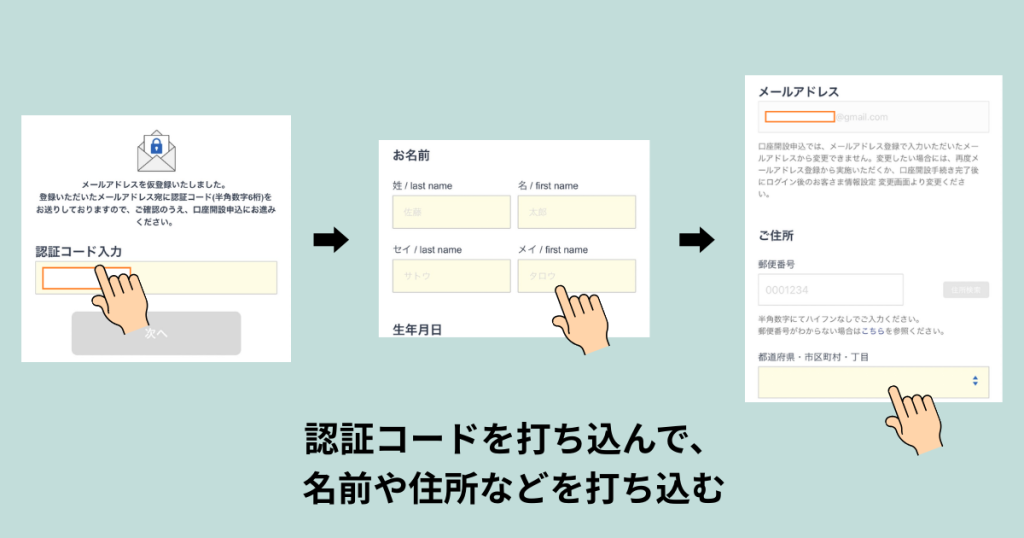 認証コードを打ち込んで、名前や住所などを打ち込む