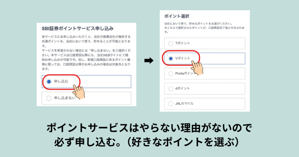 ポイントサービスはやらない理由がないので必ず申し込む。(好きなポイントを選ぶ)