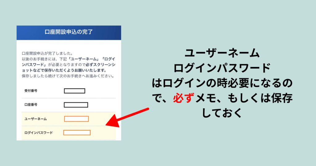 ユーザーネーム・ログインパスワードはログインの時必要になるので、必ずメモ、もしくは保存しておく