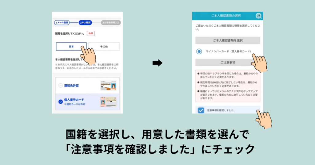国籍を選択し、注意事項を確認。
